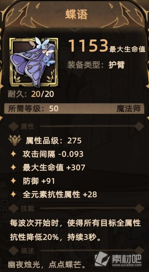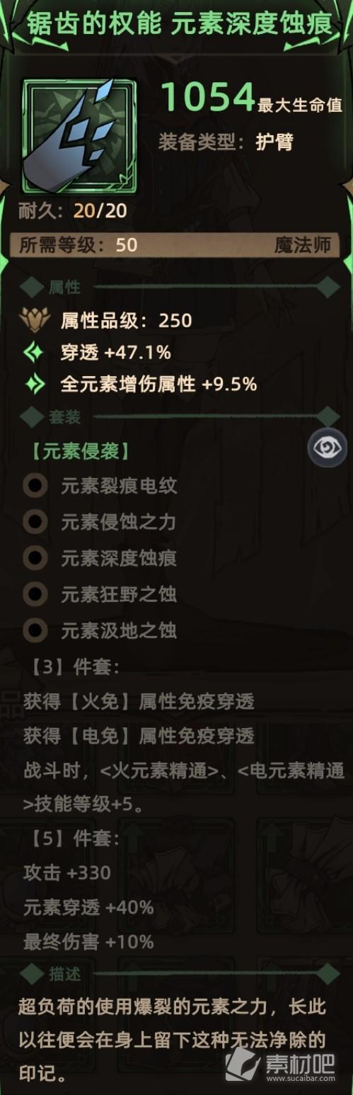 关键词:随机词条、元素增伤(套装效果)、降低肃正(套装效果)、全技能等级(套装效果)。