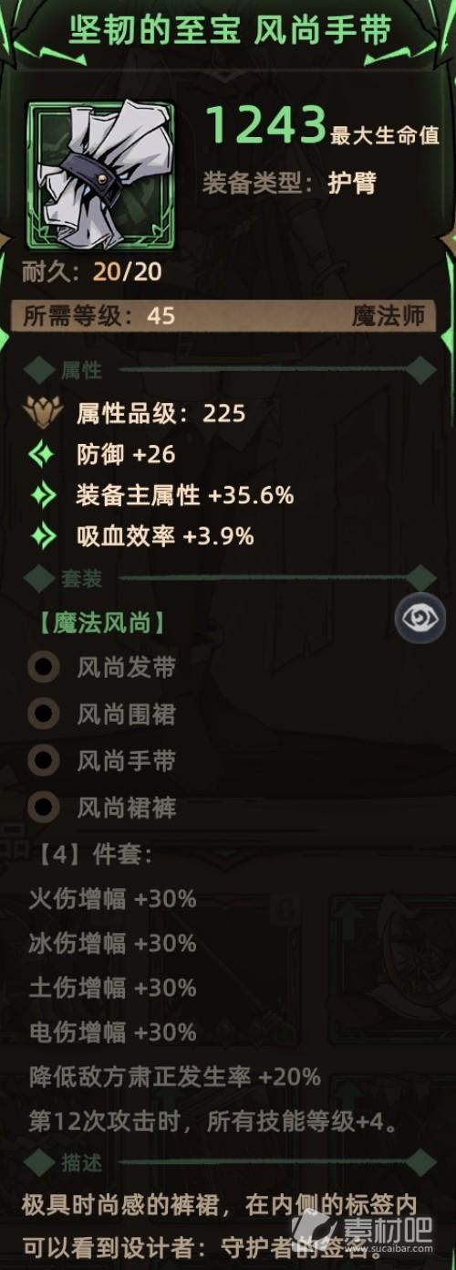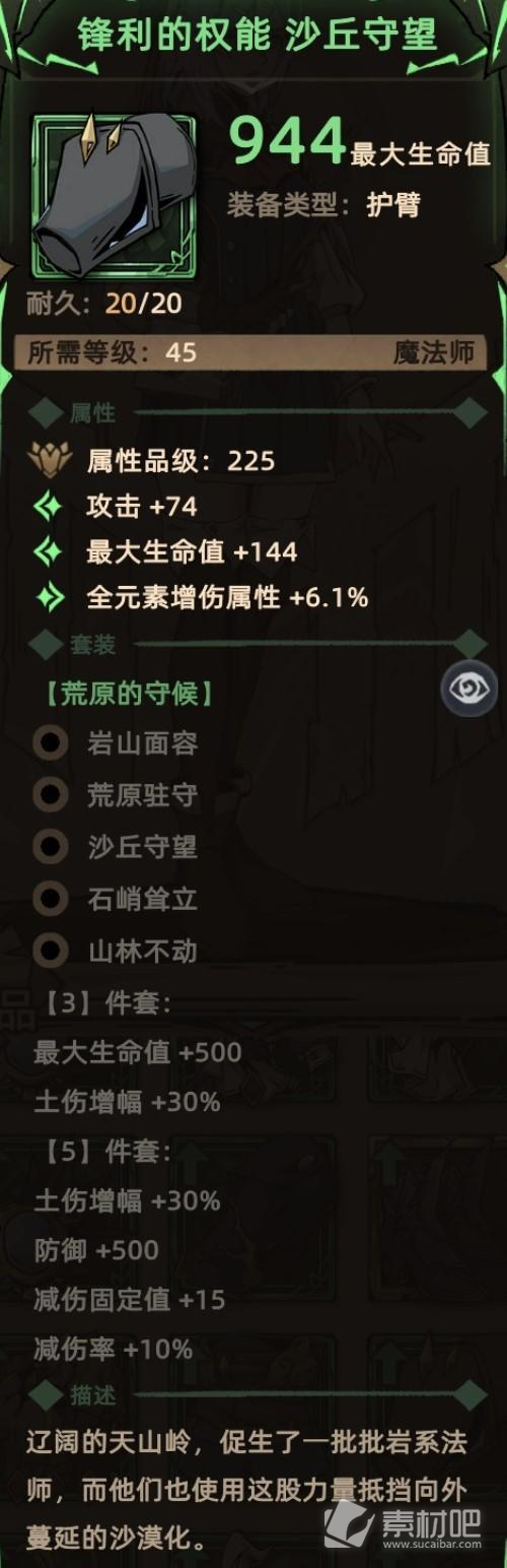 关键词:随机词条、生命(套装效果)、土伤增幅(主动触发、套装效果)、防御(套装效果)、减伤(套装效果)。