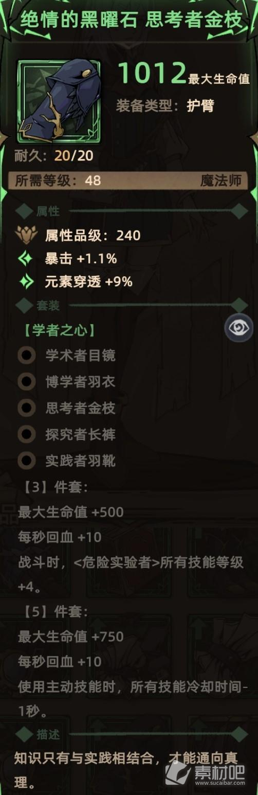 关键词:随机词条、生命(套装效果)、生命恢复(套装效果)、危险实验者技能等级(套装效果)、技能冷却(套装效果)。