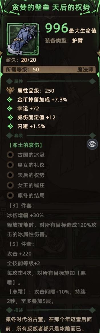 关键词:随机词条、冰伤增幅(套装效果)、额外伤害(主动触发、套装效果)、攻击(套装效果)、全技能等级(套装效果)、寒霜(被动触发、套装效果)。