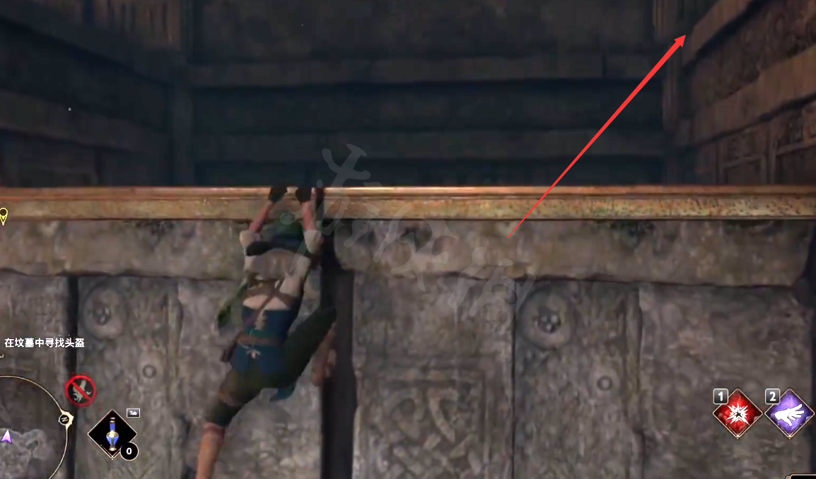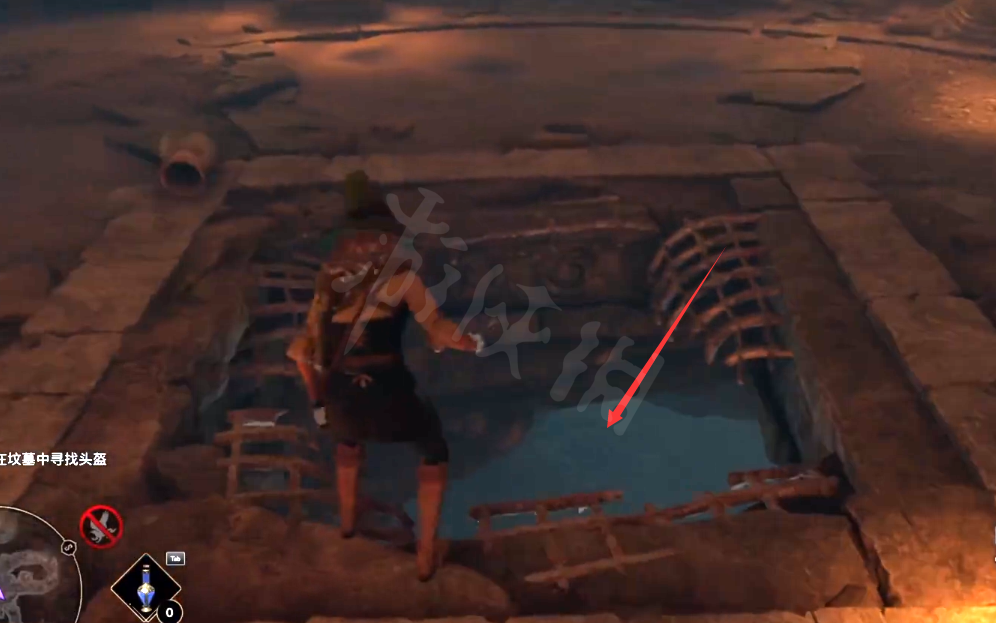 13、跳落下去进入水中,有两条路,往任务标记方向走,另一条是回到上面的路,如图方向。