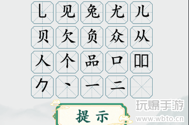 丶、一、二、口、吅、吕、品、人、个、从、众、欠、负、儿、尤、兔、免、见、贝、乚。