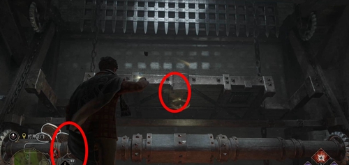跳下去使用箱子堵住断裂的楼梯,再爬上去