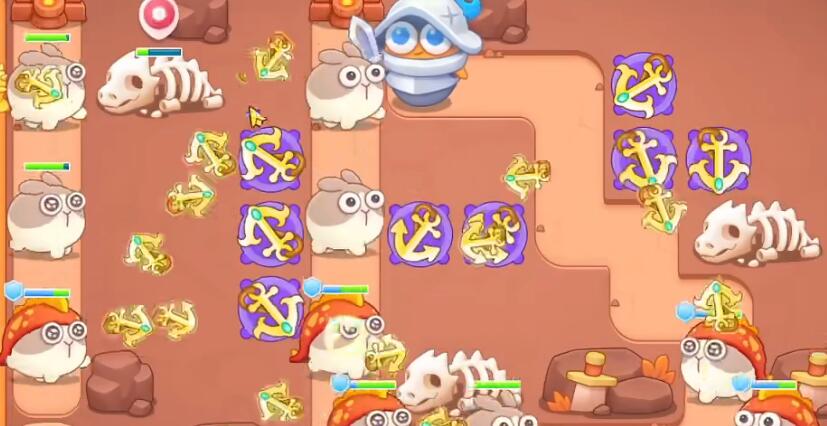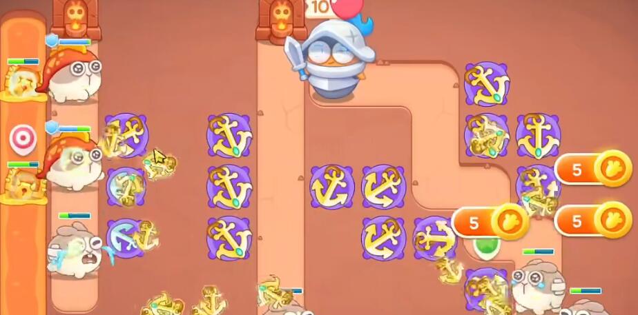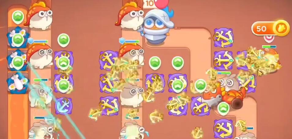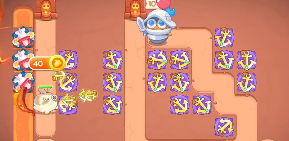 1、首先在地图的右上放置一个3级的船锚用来清左边的道具。