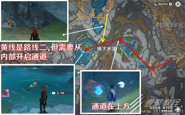 来到地下水泽的钓鱼点两条路线,黄色箭头的路线距离较短,但需要先通过红色路线打开通道