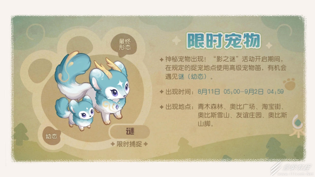 神秘宠物出现,听说它有一个美丽的名字叫做“谜”!活动期间,前往岛内捉宠地点,使用高级宠物笛有机会和“谜”相遇。