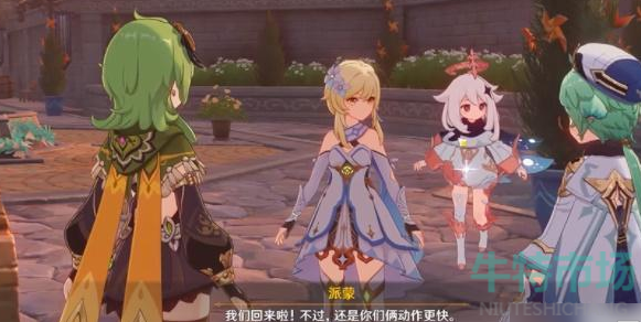 5、剧情结束调整视角,砂糖和柯莱来到望风山地,在这里找到符合预言的人选,可以遇到可莉、优菈、安柏和诺艾尔;