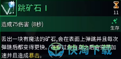 介绍:丢出一块有魔法的矿石,会在表面上弹跳并且每次弹跳后都变得更快,在穿过你自身之后会突然加速并且造成暴击。