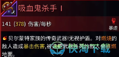 介绍:贝尔蒙特家族的传奇武器,无视护盾,对燃烧的敌人造成暴击伤害,被这把武器杀死的敌人会点燃地面。