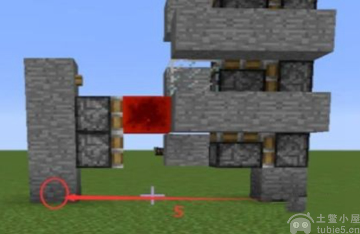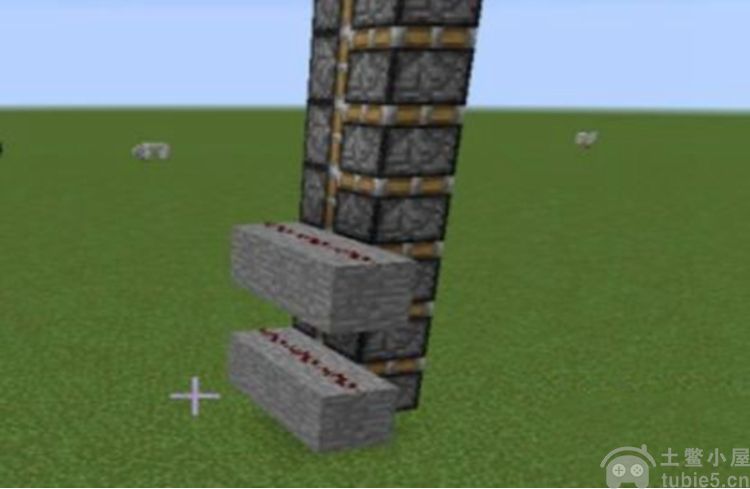 8、随后我们在底层石头距离五格的地方放置四块视图,石头的中间放两个活塞,活塞的上方安装一个按钮,第二个活塞前面放红石。