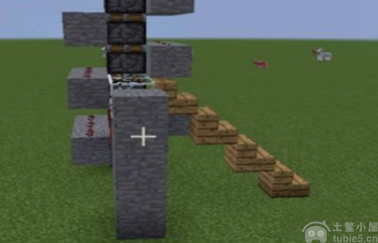 9、然后红石块的上面放一个玻璃,玻璃侧面再放置一块玻璃,然后在右侧放置一排往上通的楼梯让玩家们上楼可以到达玻璃上面。