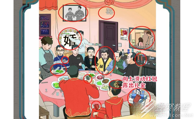 1、进击的汉字千禧婚宴-找出不应该出现在婚宴的东西分别是:离婚证、花圈、黑白结婚照、白色喜字、归家的诱惑、礼金纸钱、法师、前女友来电、拍黄瓜、大凶签、白菊花、红蜡烛