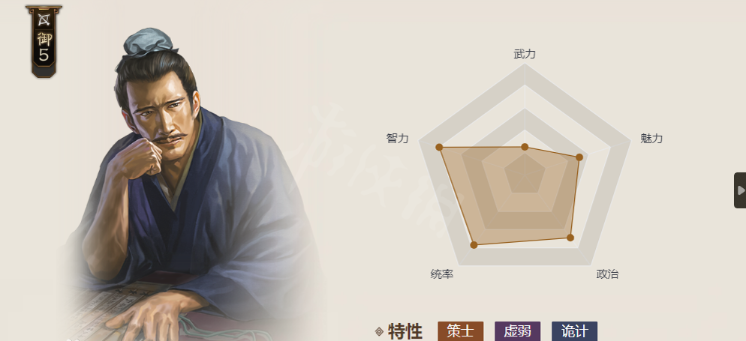 戏志才是魏阵营、弓兵种、5统御男性武将