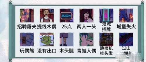 招聘屠夫、提线木偶、25点、两人一头、鬼城招牌、城堡失火、玩偶熊、没有出口、木头腿、青蛙人偶、跳楼机挂头发、过山车脱轨