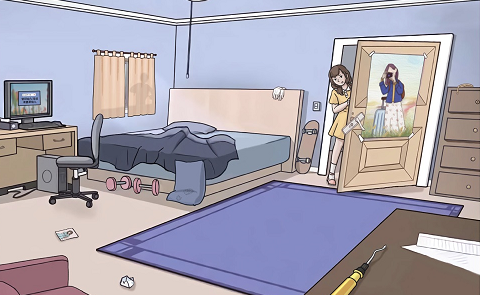 2、门口的柜子上面有【麻绳】,*个抽屉上面有【摄像头】,最后一个抽屉里面有【男士皮鞋】,床上的被子很乱,床头有【手套】,地上有女生的【照片】和湿润的【纸团】,窗户后有【人影】,沙发上是男士皮衣,旁边桌子上有【螺丝刀】。