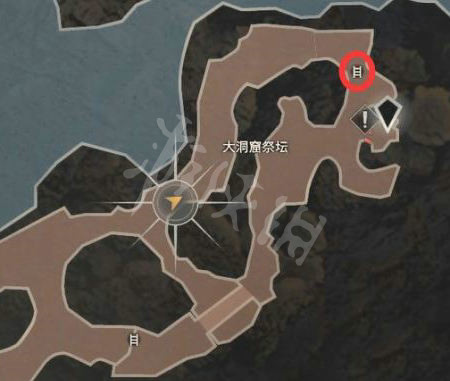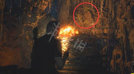 1、大洞窟祭坛深处,按钮石台谜题的提示就在附近的墙上,洞窟内有两个梯子,爬上下图位置的梯子后有个小木桥。