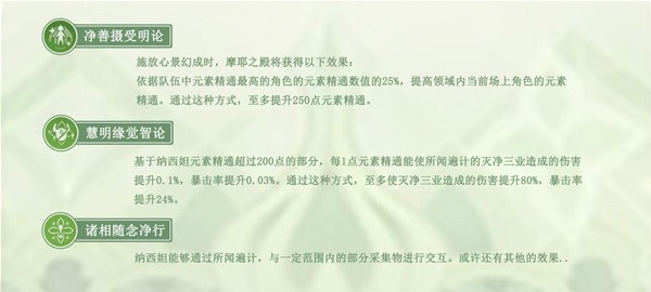 该天赋伤害提升效果是根据纳西妲的全部精通(角色面板数值)进行计算,在1000精通时能提供24%暴击率以及80%伤害加成,收益达到最大。