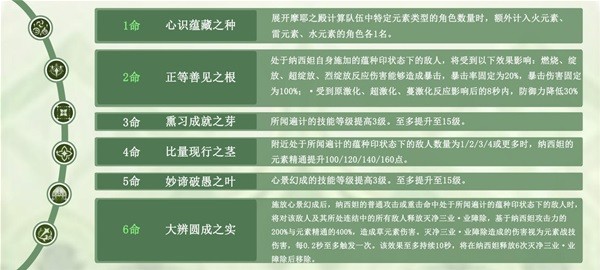 4命时根据蕴种印连接敌人的数量,提升纳西妲自身的元素精通。4命在一定程度上缓解了纳西妲的圣遗物压力,不过性价比不是很高,不推荐为了4命抽4命。