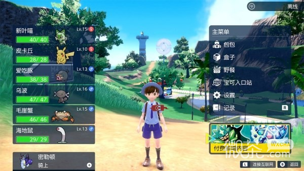 购买《零之秘宝》后,在《宝可梦:朱紫》的X键「菜单」右下方会显示出「付费新增内容」的按键,打开即可领取换装道具(无需加入NSO付费会员)。