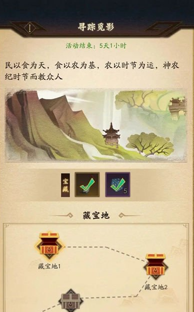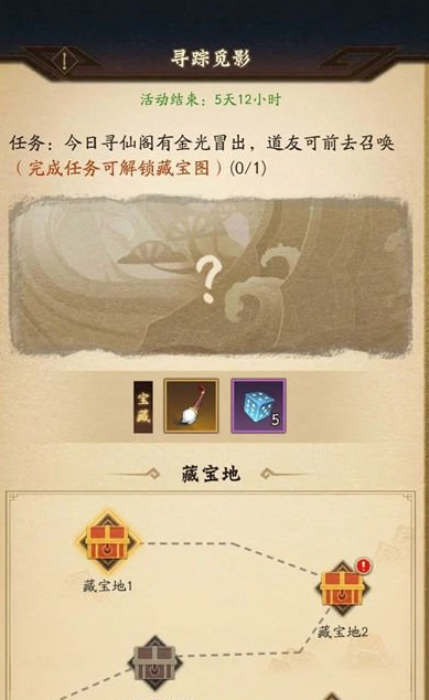 首先,我们通过蓬莱的庆典星君进入“开服庆典”界面找到“寻踪觅影”活动,进入活动界面后我们点击已解锁的藏宝地便能看到对应的解密任务,道友们需先根据任务要求完成任务,然后再返回该处才能解锁藏宝图对应的线索喔。