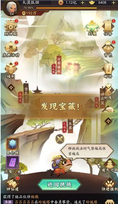 待道友来到藏宝图线索指向的章节后,界面便会浮现出“发现宝藏!”的字样,这时候在我们左下角的神器“昆仑镜”就要派上用场啦!只需轻轻点击一下“昆仑镜”它就能照穿万千迷雾助道友瞬间找到宝藏。