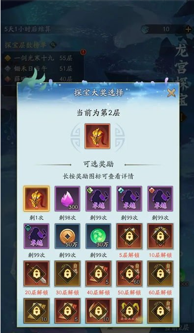 龙宫探宝每层开始都需要选择一个该层的最终奖励,每项奖励被选择的次数有一定限制,但随着层数的提高可以解锁到更珍贵的最终奖励~