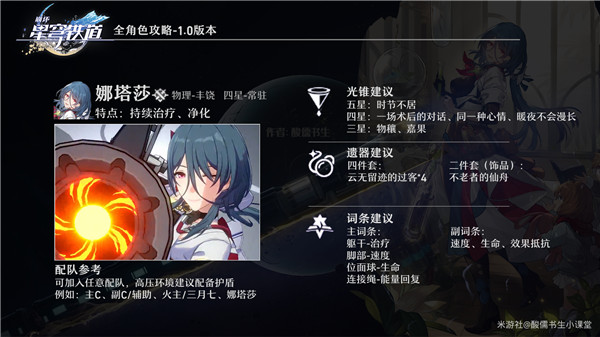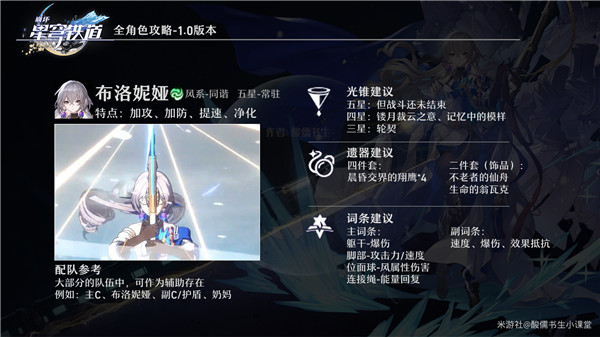 是一个功能全面的辅助角色,可提供增伤和协同攻击,自身还带有提速效果,1命后还能给队友提速。