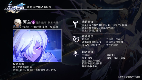 但同样也得搭配强力盾辅来提高阿兰的生存能力,别让他在高压环境中轻易倒下。另外阿兰的秘技非常适合快速推图,可在与小怪战斗时达到刚开战就快速清场的效果,