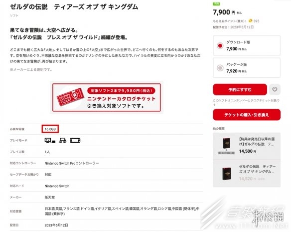 塞尔达传说王国之泪近日在日服eshop的页面有了新更新,本作原本18.2G的容量大小变为16G,少了2.2G。