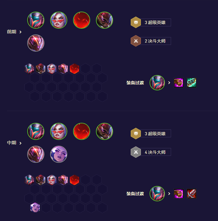 建议在开局出亚索强化时使用,可以确定之后装备的方向。前期质量低可以低人口划水连败。装备先做法爆+回复装。两星亚索可以按照正常人口节奏,开4决斗过渡。阵容发力期在3-2阶段,升6人口D出3超英4决斗羁绊。