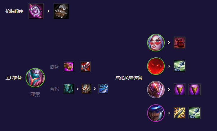 亚索推荐装备:法爆+回复装必备,第三件补水银或泰坦巨杀。水银后期上限更高。眼泪装先给后排做个电刀,电刀的破魔效果比离子更好,更适合亚索。多余眼泪装给亚索做圣杯。腰带魔抗装优先合灵风,先吹亚索面前的人,第二个凌风吹后排主C,落地直接接亚索技能。