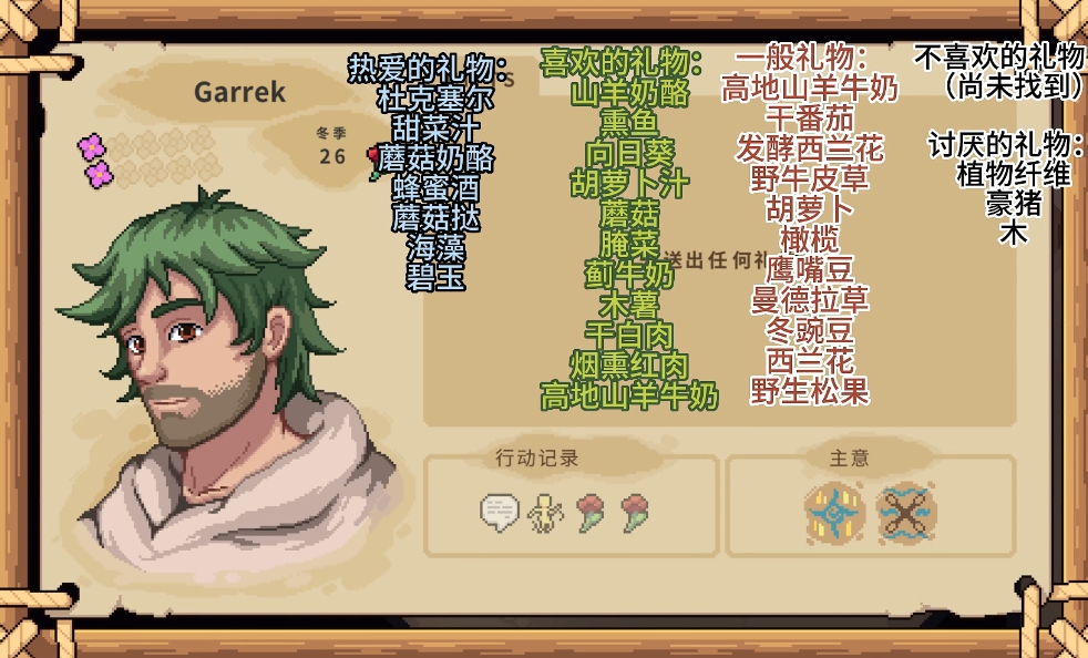 3、赠送他讨厌的礼物将会降低好感度,他讨厌植物纤维、豪猪、木。