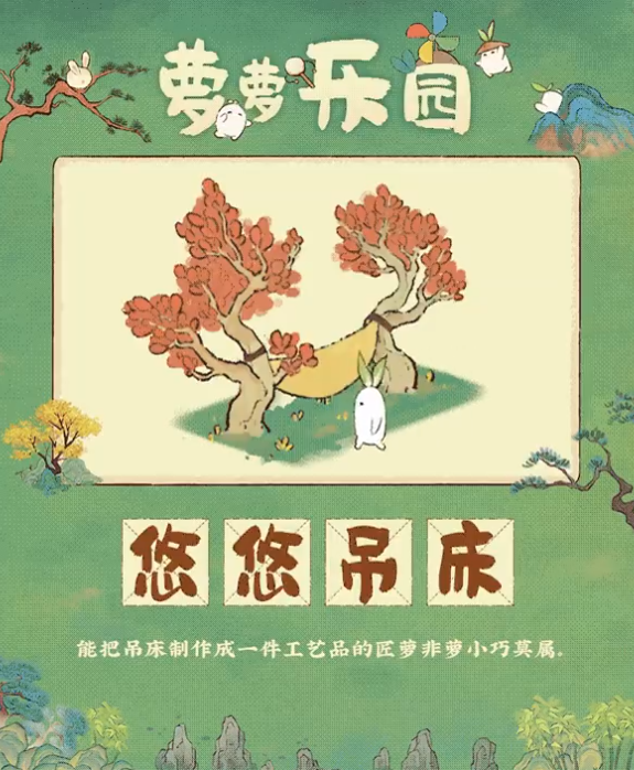 桃源深处有人家随着等级提升,游戏中有很多的娱乐建筑可以建造,它们都是萝卜们休憩时玩耍的地方,其中的悠悠吊床、萝鼓达人等是萝小巧很喜欢的娱乐方式,下面为大家带来的具体内容,感兴趣的小伙伴们一起来看看吧。