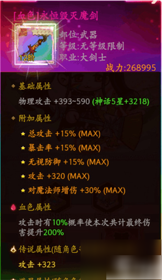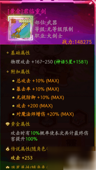 11、接下来是土豪专场价值9800 的十阶武器单从附加属性上来看就很猛了但这都不是重点最主要的是专属黄金词条10%概率提升100%的最终伤害这是武器属性 没有内置CD的一个技能下去对面不是梦想