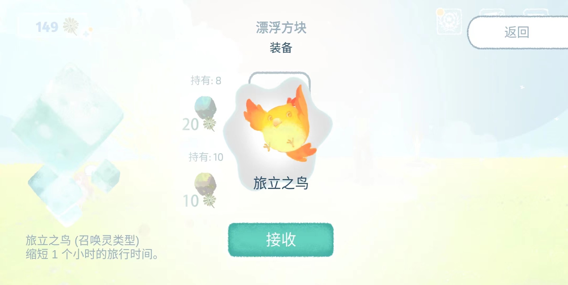 如果搜集到了1000可蒲公英可以解锁旅立之鸟,旅立之鸟可以缩短1个小时的旅行时间。旅立之鸟也是个特殊的【访客】,玩家们可以给予它喜欢的手信增加它的好感度,好感度越高回馈的手信也就会越好。