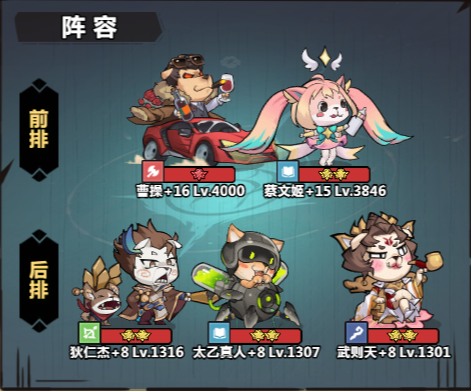 先说小怪卡关,这种情况考验着前排武将的坦度和基础属性,如果铲屎官们卡关在小怪关卡上,那么推荐更换一套控制为主的阵容缓解前排武将的血线压力,推荐的阵容为:曹操+太乙真人+武则天+蔡文姬+狄仁杰。
