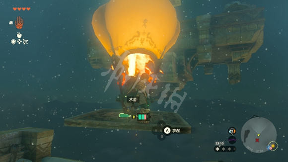 然后再利用弓箭射击火龙头,火龙头就会喷火,热气球就会慢慢的上升了,这个时候一定要快速站到木板上去,这样就能把林克带上去天空了。