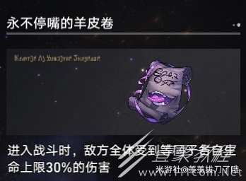 越早拿越香,有了他推图贼快,并且40%的伤害提高也使得在打首领时容错更高;另外永不停嘴的羊皮卷,如图