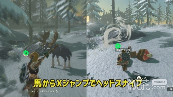 需要防寒+2,如果需要的话可以从利特村购买防寒装备。骑马寻找附近的鹿、狼、熊,按×跳跃用弓箭瞄头可以将其一击击败,不过掉下来的肉几秒钟内就会冻住→无法烹饪,因此要赶紧捡起来。