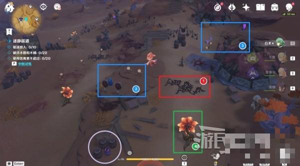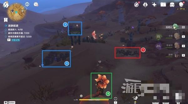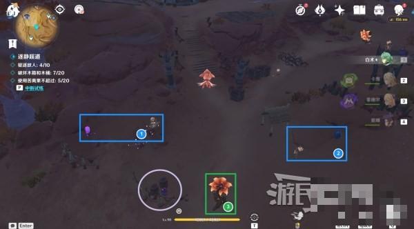 参考下方图片中的序号,右侧区域,先对①处的荆棘放苦离果烧掉荆棘,然后对②的暴雨琥珀和③的电气水晶放苦离果使旁边的丘丘人聚集在中间的训练设施处,最后对④的生气花团放苦离果,驱逐丘丘人。最后可以击碎左下方圆圈中的爆桶以完成第二个目标【破坏木箱和木桶】。