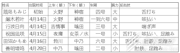 女车掌厳木若叶会在车厢连结部出现,早上出现的位置是一号车厢,晚上是三号车厢