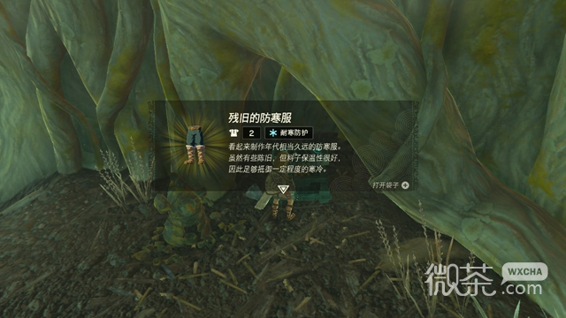 在树洞里面打开宝箱,就可以获得一件【残旧的防寒服】了,穿戴在身上就可以免受寒冷的袭击而掉血了。