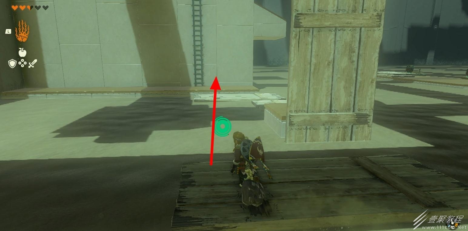 随后通过木板到达对面平台后通过梯子向上。