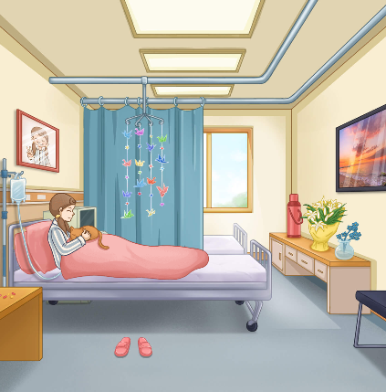 2、病房A:收集千纸鹤、电视上的旅游风景、病危通知书、家庭合照、怀里的猫