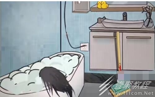 5、进入卫生间,找到浴室机关、带血拖把、电线