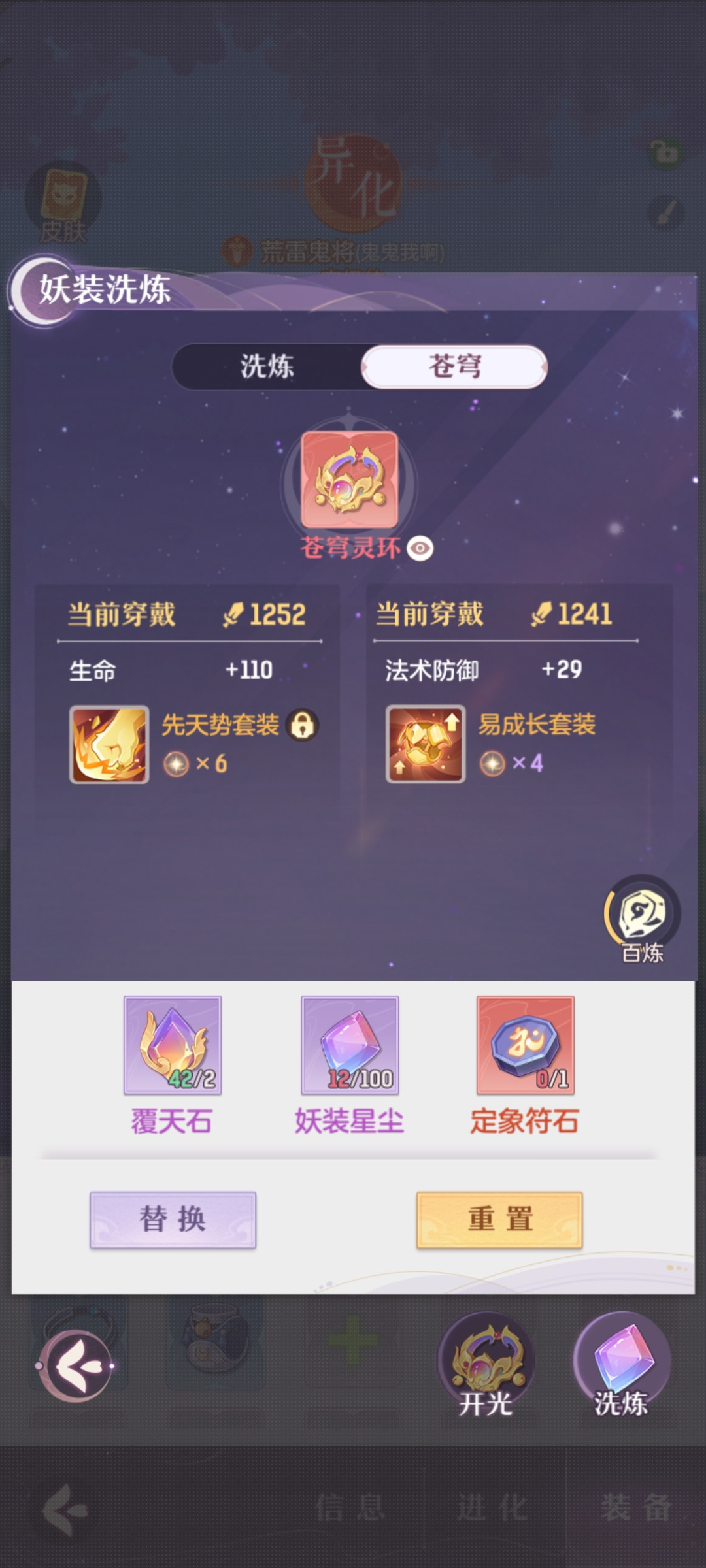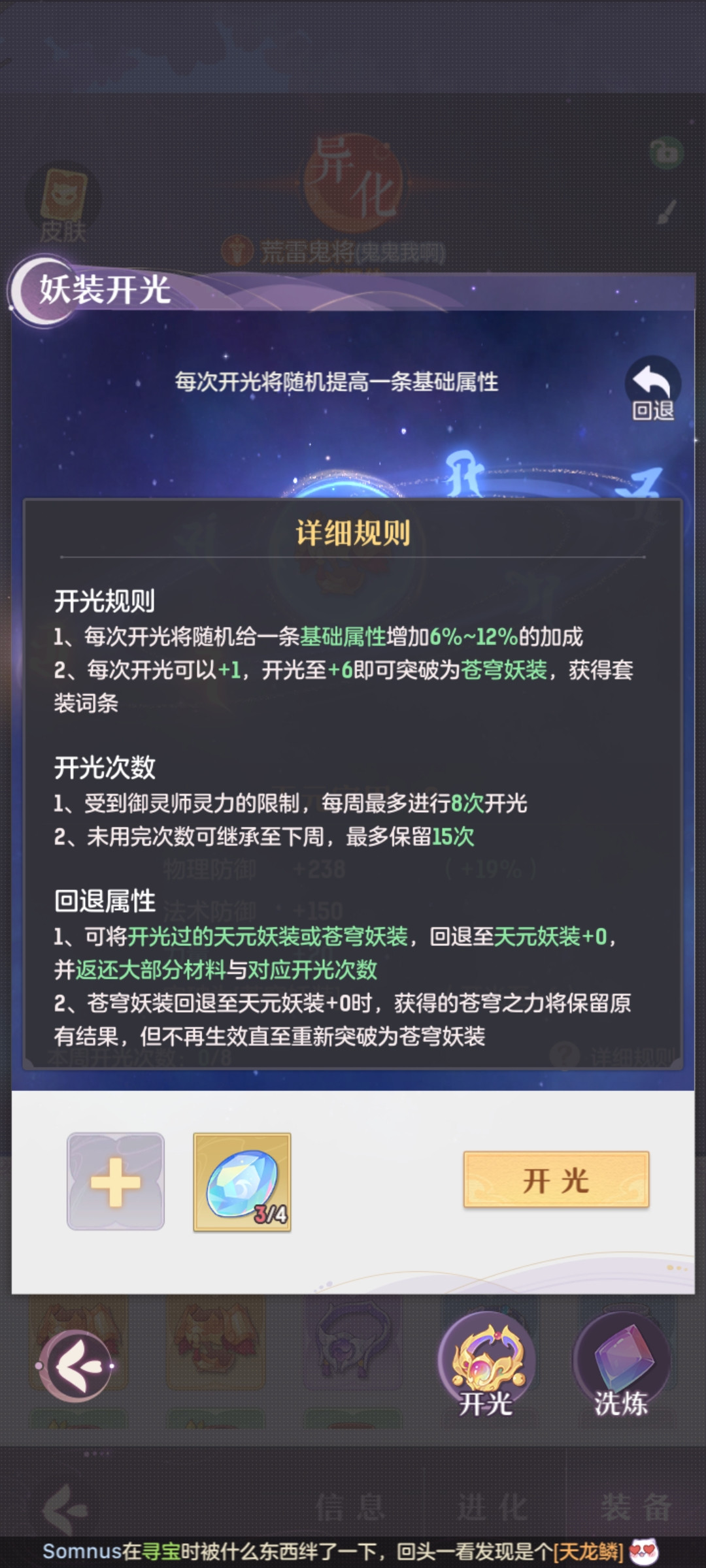 1、天元装备开光到加六成品自动变成苍穹装备,并获得套装效果,除了消耗开光石还需要消耗阴阳晶核,一件阴阳装备等于两个晶核一件天元装备升级为苍穹装备需要消耗四件天元装备