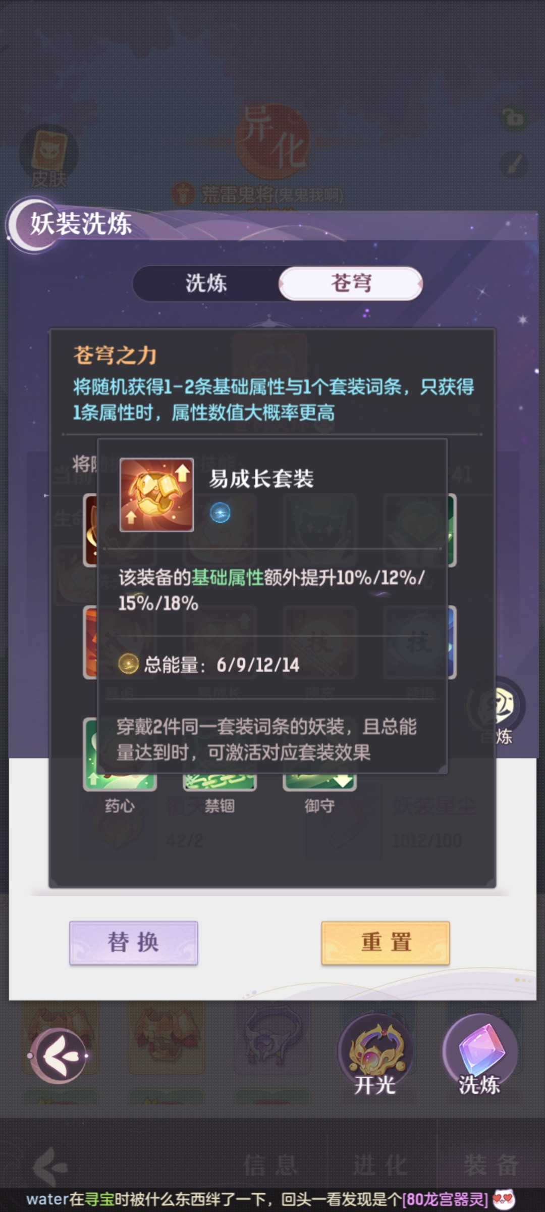 2、苍穹装备开光后根据基础属性获得百分比加成和套装效果,每次开光随机获得一项属性的百分比提升。套装效果两件套才能生效,套装技能下方的能量值对应了套装效果,能量值越高套装效果越好。