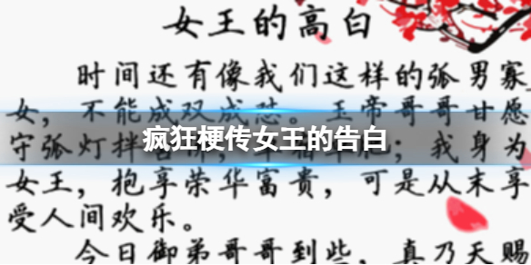 以上便是为大家带来的疯狂梗传女王的告白的内容,感兴趣的小伙伴可以去体验一下。更多消息和内容关注本站手游,之后会持续给大家带来更多全新的内容