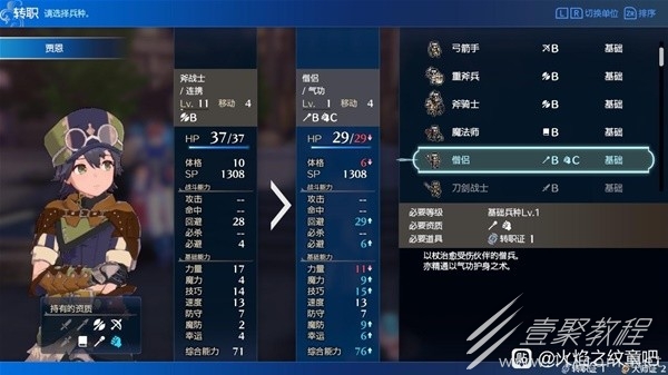 下图是我的11级贾恩,转回僧侣是方便查看到底涨了多少属性。可以看出我的贾恩比固定的多了力技,少了双防。除了体格多涨了1.5,算是惊喜,当然如果你玩超难,这个数据也差不多,不是血马凹点那种。转了勇士之后11体格20力38血16技15速,非常强。