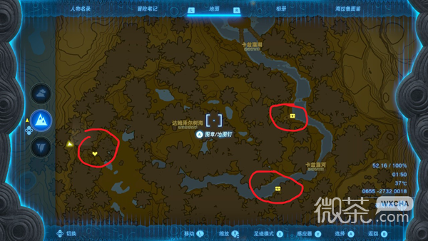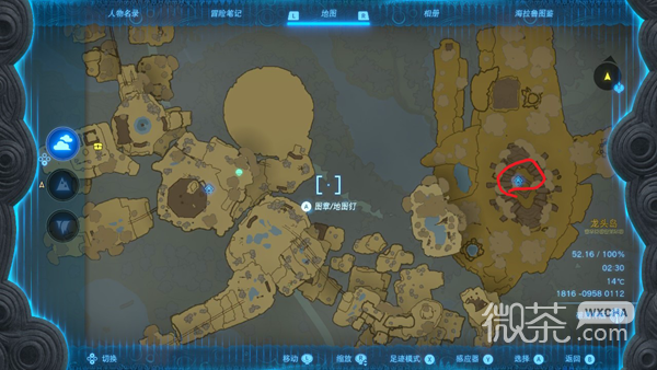4、到图示的两个 宝箱标志处,分别获得裤子和头。再到左侧爱心标志处,把得到三件的“雷光套装”穿上,将一个“左纳乌能源”放在台座上(任务过后可以拿回来),启动遗迹装置,这样雷鸣之岛和龙头岛的雷云就消散了。